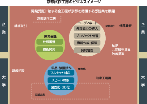 私たちは、部品・単品、装置試作から商品化、量産化、アセンブルや物流までを一貫して担う、職人の(悉皆屋/しっかいや)コーディネータ集団として、「京都試作クラスター」のフロントランナーをめざしています。試作に係わる機器やシステム開発、産地活性化の事業開発を行ない、各プロセスのノウハウを商品化するお手伝いをいたします。