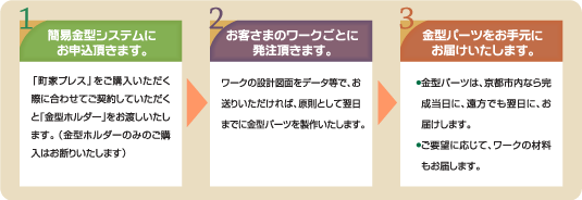 WEBや宅配を利用して、ワークにあわせた金型パーツを迅速にお届けします。